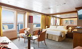 Самые привилегированные каюты с точки зрения площади, а также особых видов сервиса. Благодаря необычному расположению сьюта, гостям открывается великолепная панорама с собственной просторной веранды, на которой также для комфорта гостей расположены уютные шезлонги и столик. Благодаря наличию балкона увеличенной площади и панорамным окнам в каюте всегда много света. Максимальная вместимость: 4 чел