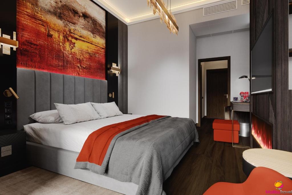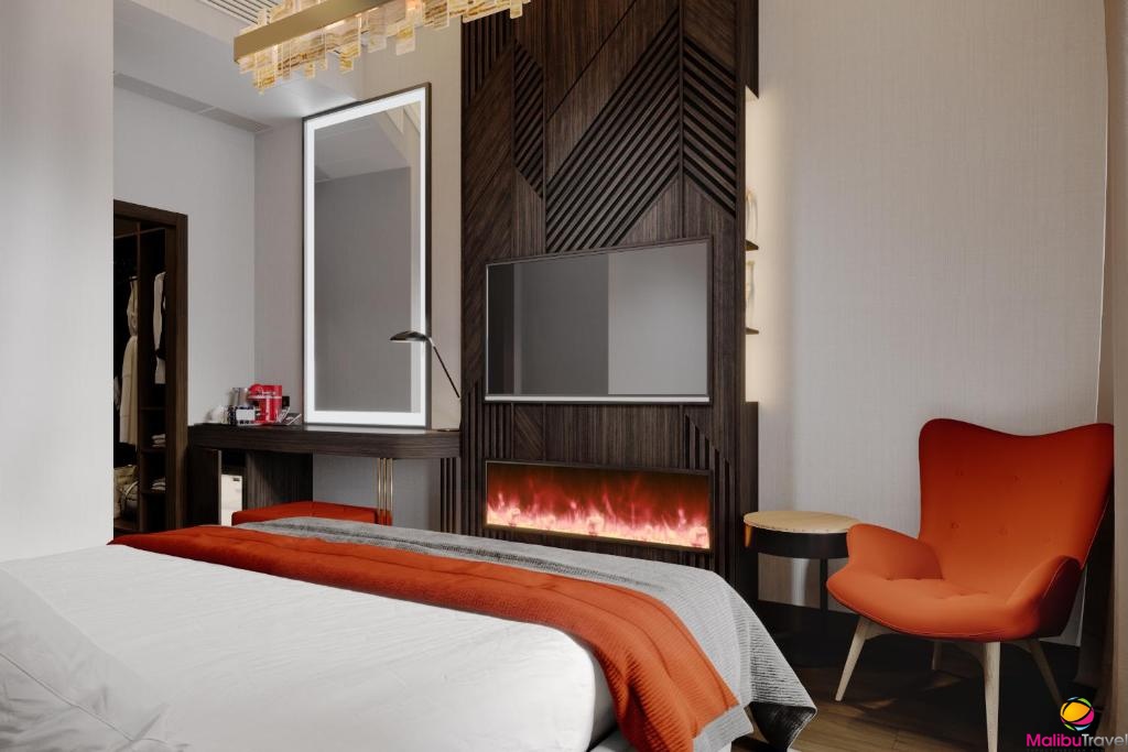 В номере: санузел с душем, кондиционер, плазменный телевизор, электрочайник, интернет, сейф.
