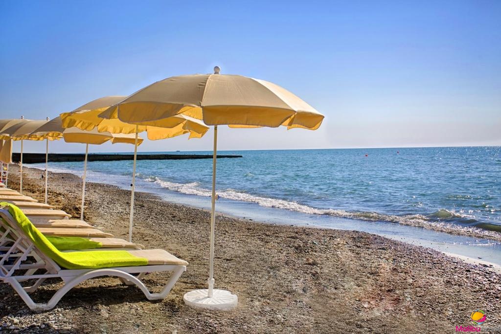Пляж: песчано-галечный пляж, шезлонги, зонтики и теневые навесы, работает бар, есть кабинки для переодевания, душевые, туалеты.